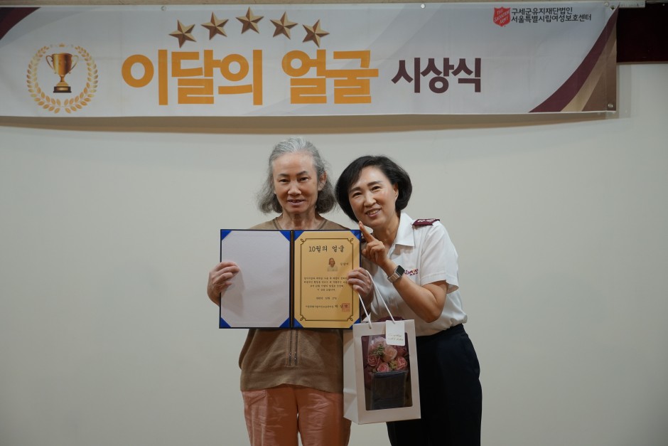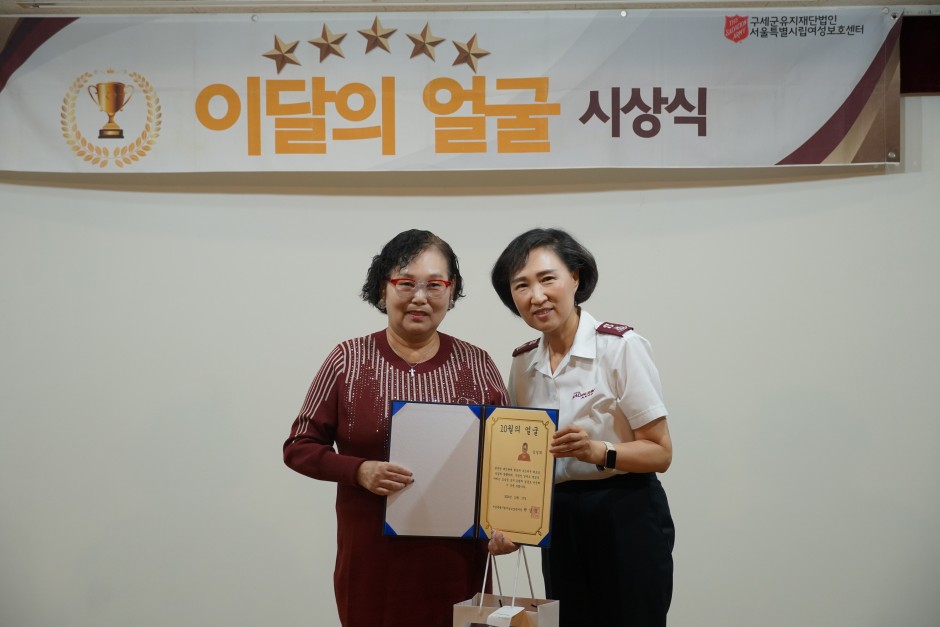 - 원만한 대인관계 형성과 부드러운 태도로 성실히 생활하며, 작업장 일에도 열정을 다하는 모습을 보여 이달의 얼굴로 선정해 이 상을 드립니다.